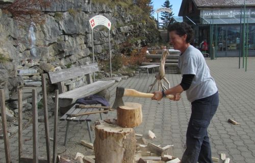 Wir spalten Holz, um auch in kühlen Tagen unser Wohnhaus zu heizen mit dem Schwedenofen. Das Holz stammt von der Schynige Platte, da wir genug Rotfichten im Garten haben.