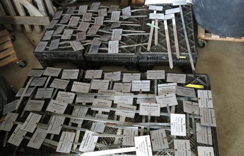 Im Frühling werden die Pflanzen etikettiert im ganzen Garten. Die Stäbe werden der Pflanzengrösse angepasst. Im Herbst wird jede Etikette wieder im Keller eingeräumt.